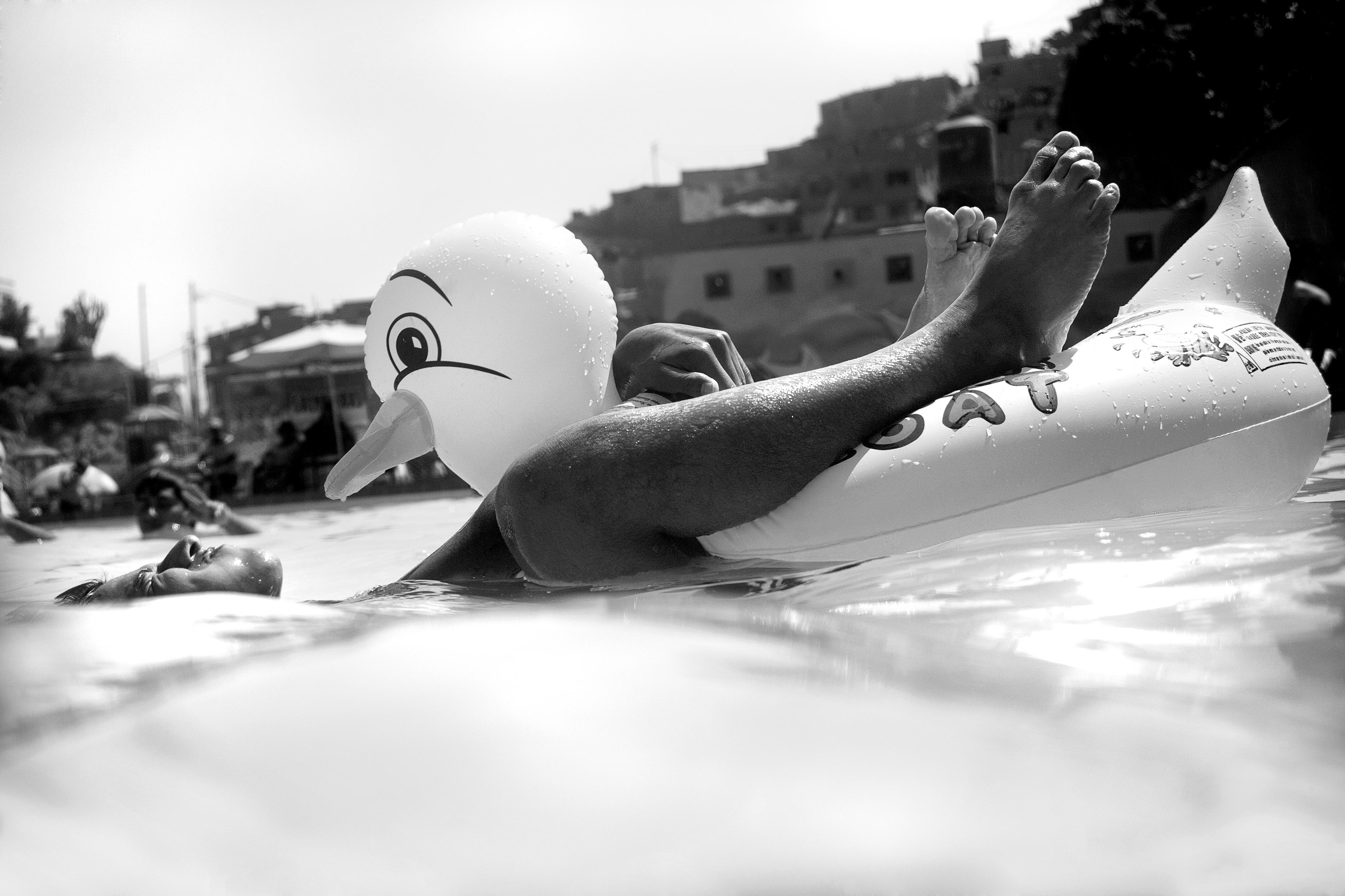 Dos años más tarde lo hice. Empezó el verano y empezaron mis visitas continuas por muchos de estos clubs, todos los que me querían abrir sus puertas. Solía ir los sábados y domingos, que es cuando estos espacios congregan más gente. Las primeras veces sólo observaba lo que sucedía, había tanto pasando en tan poco tiempo. Las siguientes veces ya sacaba mi cámara y fotografiaba. Compré un estuche para el agua, por lo que muchas de las imágenes que son parte de la serie son hechas dentro de las piscinas. El estuche lucía como un flotador, lo que me ayudaba a que la gente no sienta los nervios de tener un lente enfrente y actuaban como si nadie los viera. Cada verano, durante dos años, asistí asiduamente, encontrándome situaciones maravillosamente particulares y gente que se divertía con un poco de agua y un par de prendas que hacía de trajes de baño. La gente era feliz, se refrescaban sin mirar quien estaba al lado, este desprendimiento del no compararse ni comparar al resto, estando los cuerpos tan expuestos, era lo que más me gustaba. La libertad de poder estar tranquilo con pocas telas encima, algo que normalmente no pasa cuando se está en una playa de clase media o alta, donde todo el tiempo estás bajo la lupa de tus espectadores, que muchas veces son los mismos que te acompañan.