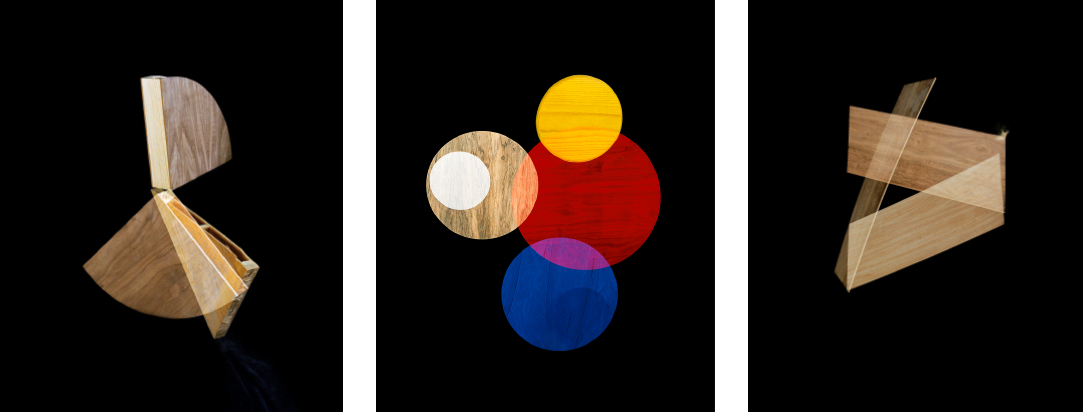 Al pensar en qué formas uso como bloques de construcción para Geometry of Space, reexaminé las pinturas de Laszlo Moholy-Nagy como punto de partida para este trabajo. Me centré en sus pinturas de intersecciones de planos geométricos suspendidos en el espacio, y construí varios objetos de madera tridimensionales utilizando las mismas proporciones en varios tamaños. Estos se convirtieron en el idioma principal de la mayoría de las imágenes en Geometry of Space.