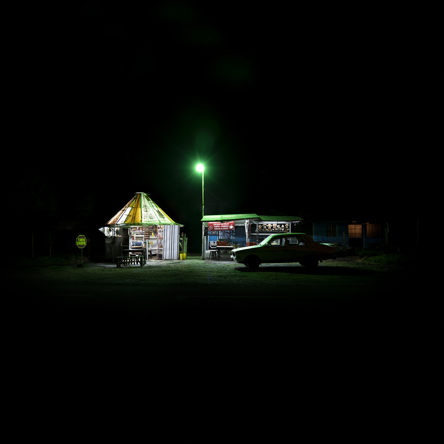 Each photo reveals a different structure lit through colourful flashes on desolate Colombian roads, creating an urban landscape in the darkness of the night. A concern to discover who inhabits these lonely territories is a question in the photographer’s mind. Beyond documenting these somewhat sculptural locations these photographs depict moments of roads that appear and disappear in vestige of the night.
