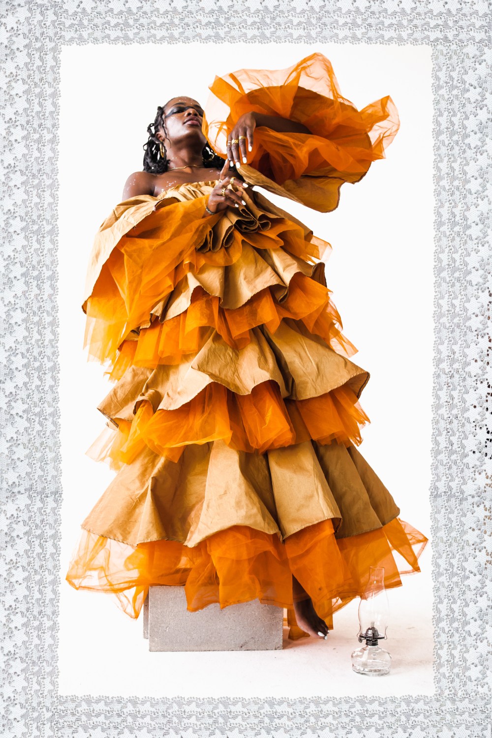 In Haiti, the CMU block is more than construction material; it is a seat, a stand for a radio, or a podium. Each block carries the improvisations of our streets. With a gas lamp at her feet, the model appears in a trance-like state, reflecting the otherworldly aspect of Michel Chataigne’s design. Hand-stitched lace around the photograph enhances the image by embedding memory into it; transforming the photograph into an archival object that preserves both the garment and the stories it carries.