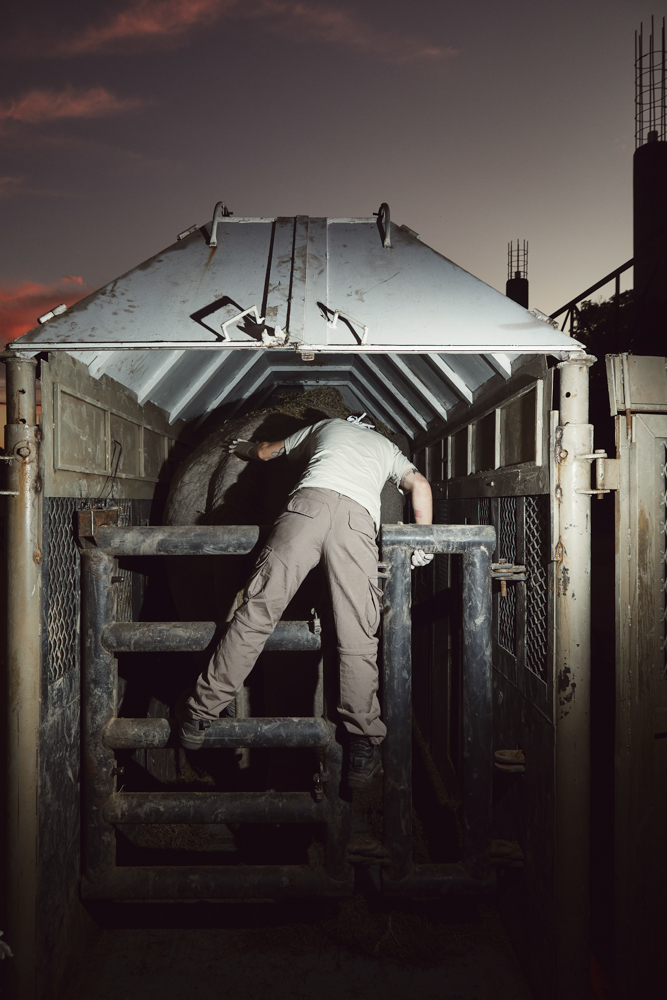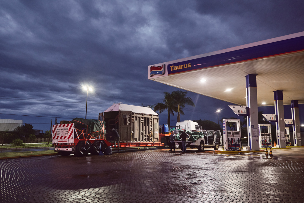 Dawn in a gas station in Dourados, Mato Grosso Do Sul Brasil. At 3.30 in the morning we arrived at a hotel by the road in the city of Dourados, Mato Grosso do Sul. As the gas station was closed we were able to park the truck with the elephant at its side. We went to sleep and by 5.30 we were up. Scott Blais, the owner of Elephants Sanctuary Brasil slept in the car taking care of Mara.