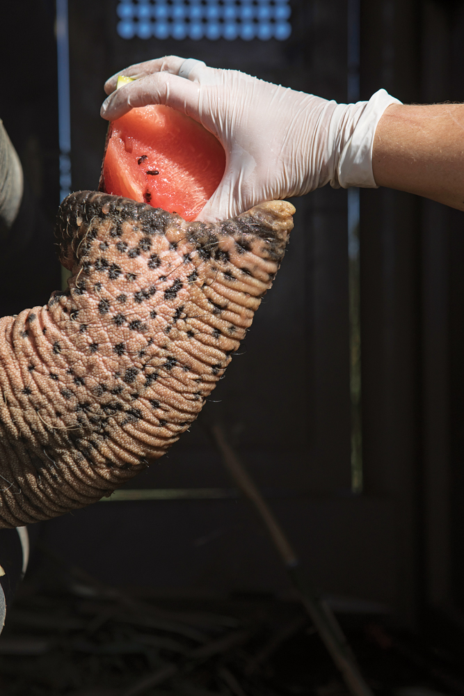 Mid-day stop in Yapeyú, province of Corrientes, Argentina. Mara is fed with some watermelon by one of her caregivers. ©Sofia Lopez Mañan