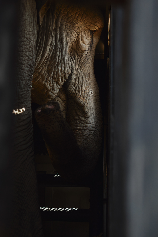 The transfer elephant with Mara inside is lifted up from her outside enclosure in the Buenos Aires Ecopark and placed over a truck that will drive her 2700 km to the Brasilian Mato Grosso. At 17hs she went into the box, by 19hs we were leaving the Ecopark. ©Sofia Lopez Mañan