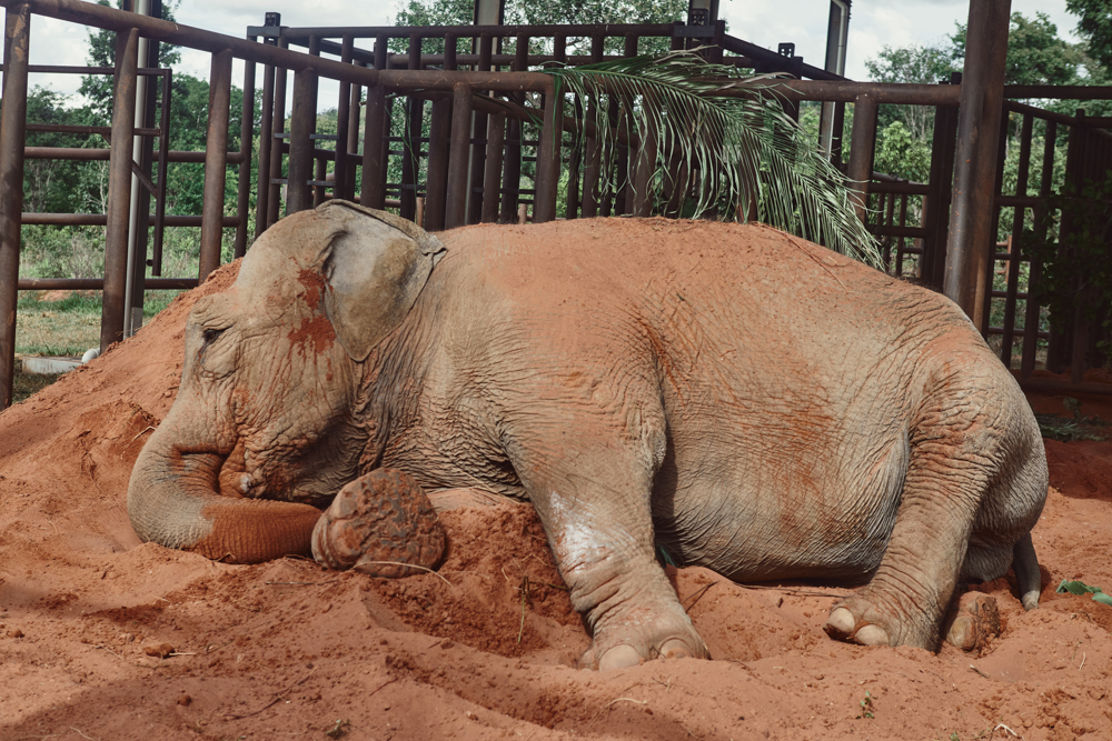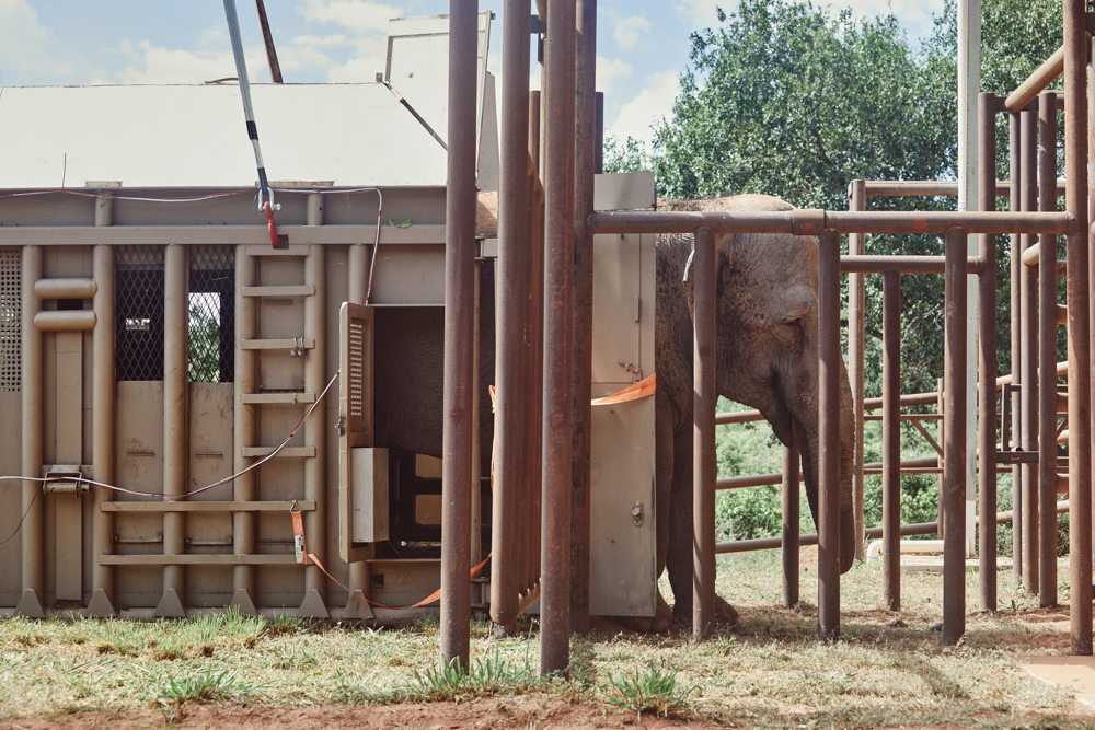 The transfer box with Mara inside is lifted and placed in an outside enclosure. The door is opened and she can leave and explore that small area at her speed. The color of elephants is the color of the soil where they live. As soon as she got out of the box she started throwing soil over her body. They do this to regulate temperature and to groom their skin from parasites. ©Sofia Lopez Mañan