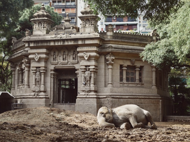 Mara prepares for her daily nap in her outside enclosure at the Buenos Aires Ecopark. Mara is a 54 year old Asian elephant that was born in India and lived most of her life in captivity. When the Rodas Circus went bankrupt in 1995 she was taken to the former zoo of Buenos Aires, now Ecoparque, where she lived with two african elephants that are still there.The former zoo is one of the oldest original Victorian zoos in the world. The elephants enclosure known as the Hindu temple of Elephants was built in 1904 as a replica of the Hindu Temple of Elephants in Bombay. ©Sofia Lopez Mañan